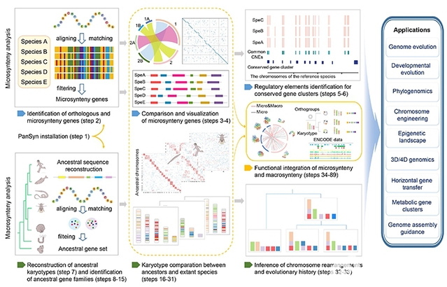 PanSyn not only contains a comprehensive micro-collinearity analysis module, but also greatly compensates for the lack of macro-collinearity analysis tools and innovatively proposes an integrated analysis module that integrates micro- and macro-collinearity as well as regulatory genomics data. Compared with mainstream software and tools, PanSyn has obvious advantages: in micro-collinearity analysis, it can make comprehensive analysis from single to multiple comparison, from simple to complex ploidy, from low-dimensional to high-dimensional networks, and from structure to function; in macro-collinearity analysis, it can reconstruct ancestral genomes, cluster ancient genes, estimate karyotype conservation and chromosome evolution; in integrated analysis module, it puts forward the strategy from micro- to macroscale and from macro- to microscale and achieves systematic estimation and analysis of pan-evolutionary genome between ancestors and extant species. It also integrates multidimensional functional genomics data, provides a more comprehensive and in-depth functional interpretation perspective for the understanding of genome evolution. The research team has provided detailed instructions and application demonstrations of PanSyn, which is highly customizable to meet users’ specific analysis needs.