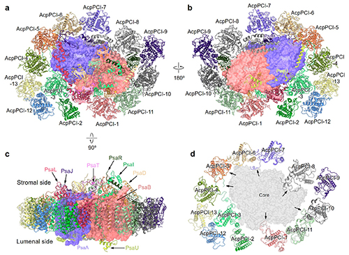 With single-particle cryo-electron microscopy, this research investigates the high-resolution structure of PSI-LHCI and its structural features. The core of PSI consists of 13 subunits including two newly identified subunits, PsaT and PsaU, and the periphery of the core binds 13 trapping units containing chlorophyll a/c (Chl a/c) and light-harvesting complexes (AcpPCI) of peridinin. Compared with other PSIs of red algal evolutionary clade, the core subunit PsaD/E/I/J/L/M/R and terminal structures of the light-harvesting complex AcpPCI-1/3/5/7/8/11 subunits have extended and interact with the surrounding subunits. The core subunits PsaA and PsaB are structurally conserved, but in PSI-AcpPCI, the superficial loop structure changes significantly which also interacts with the extended structure of special subunit. These special structures strengthen the connection among central subunits, promote the stability of the complex PSI–AcpPCI and help PSI-AcpPC adapt to the particular symbiotic environment.