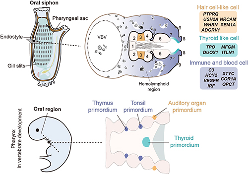 This research is the first to apply the Stereo-seq and single-cell RNA sequencing in evolutionary developmental biology of marine animals, and to identify the cellular components of the evolutionarily unique pharyngeal organ in a high-throughput way. The results provide methodological references for further understanding the pharyngeal organ’s composition, which is an evolutionarily important and unique group of marine organisms. It provides high-quality data and novel insights into the origin of the pharyngeal organs.