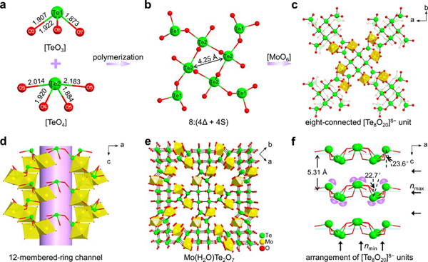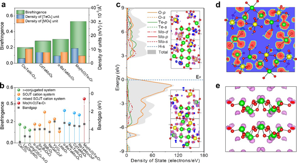 This research proposed an oxygen anion polymerization strategy to achieve large birefringence in oxides by polymerizing three oxygen anions with strong polarizability anisotropy. The research team used X-ray diffraction analysis of single-crystal structures in conjunction with first-principle simulations to explore and clarify that the large birefringence and strong frequency doubling effect achieved by MTO can be attributed to the synergistic effect of polymerized tellurium-based oxygen anions and molybdenum-based oxygen anions. The experiment shows that MTO has a UV absorption cut-off at 366 nm and a large birefringence (0.528@546 nm), which is the largest value among the inorganic UV-transmitting oxide crystalline materials reported so far, and a strong frequency doubling effect (5.4× KDP). This study is of great scientific significance for the creation and development of new large birefringent crystal materials in the UV band.