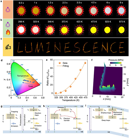 To address these challenges, Prof. Zhang Juncheng’s team proposes the strategy of using intrinsic and non-intrinsic defects to synergistically induce multi-physical field luminescence. Through introducing a trace amount of Mn2+ activator into a self-activated gallate matrix, they obtain multi-modal luminescence with dynamically color-changing fluorescence in a single material for the first time and demonstrate the color, pattern and light intensity regulated by the force-heat-photophysical field dynamic changes and sensing applications in the temporal and spatial dimensions. This research provides important support for the development of dynamic multimodal luminescent materials and clarifies the trap-controlled dynamic luminescence mechanism. It is expected to promote the application of materials in dynamic luminescence color rendering, higher-order anti-counterfeiting encryption, and multi-stimulus sensing.