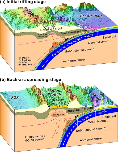 Many seamounts exist above the Pacific plate on the outer side of the Mariana Trench, and some of them have HIMU-type geochemical compositions. These HIMU-type seamounts subducted with Pacific Plate into the deep mantle and circulated and stored in the form of mélange with altered oceanic crust and subducted sediments within the overlying plate sheet. After that, with the opening of the rift valley, HIMU components were activated, and then entered into the rift valley mantle source region. Due to the subduction of many HIMU-type seamounts on the Pacific plate sheet, HIMU component may be present in most of the Mariana subduction zone, but significant HIMU component signals only appeared in the initial stage of rift evolution. This may be because of the low degree of melting of mantle portions during the rift period, preserving the HIMU component signals, which were either consumed in the back-arc region or masked by back-arc MORB-type mantle flows. The study of melt inclusions provides comprehensive information for our knowledge of material cycling in subduction zones and material composition of mantle source region.