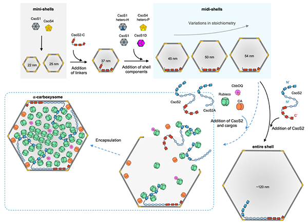 This study analyzed the structure of an artificially synthesized α-carboxysome shell that contains all the shell proteins and the C-terminal domain of the key linker protein CsoS2 (CsoS2-C). Cryo–electron microscopy at the atomic-resolution of the shell assemblies, with a maximal size of 54 nm, unveiled diverse assembly interfaces between shell proteins, and detailed interactions of CsoS2 with shell proteins to drive shell assembly. The study found that unlike the fixed inclination angles formed between hexamer and pentamer protein assemblies, the inclination angles between two hexamer assemblies are more complex and variable. The C-terminal domain CsoS1C of the linker protein forms multi-point interactions with the shell proteins and adopts two different conformations to facilitate shell assembly. Moreover, based on biochemical and crystallographic methods, the research revealed that homologs of hexamer and pentamer monomer proteins can form heterohexamers and heteropentamers.