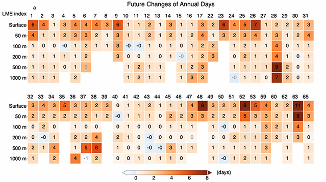 Marine heatwaves refer to extreme events characterized by abnormally high sea surface temperatures, which have significant impacts on ecosystems and socio-economic development. Marine organisms often react to extreme ocean temperatures by either migrating horizontally toward the poles or vertically to deeper ocean layers. Recently, the team led by Professor Gao Huiwang and Professor Zhang Shaoqing from Frontiers Science Center for Deep Ocean Multispheres and Earth System proposed a future threshold method based on simulation predictions of future climate change scenarios using a high-resolution Earth system model (with an atmospheric resolution of 25 kilometers and an oceanic resolution of 10 kilometers). This new method takes into account biological adaptability, and analyzes anomalous warming events relative to long-term average changes in future sea temperatures. With this method, the team evaluated the characteristics of future marine subsurface heatwaves in the global ocean and coastal marine ecosystems. Their research findings, titled “Intensification of future subsurface marine heatwaves in an eddy-resolving model”, have been published in Nature Communications, an internationally prestigious journal.
