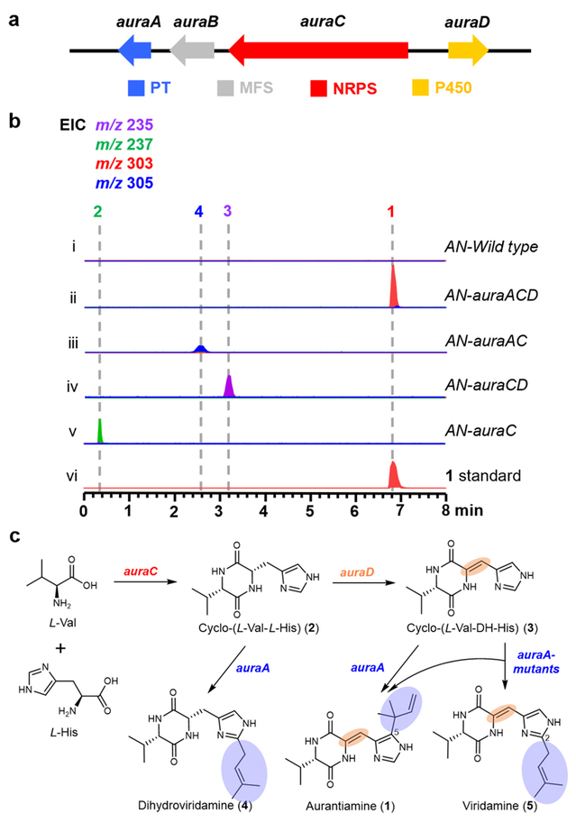 Researchers activated silent genes in the marine-derived fungus Penicillium solitum HDN11-131 and obtained the DKP compound aurantiamine, which features imidazole-C5-trans-dimethylallylation. To further study the process of imidazole prenylation, the biosynthetic gene cluster aura of aurantiamine was first identified in P. solitum HDN11-131. This gene cluster includes genes encoding DMATS family PT (AuraA), MFS transporter (AuraB), bimodular NRPS (AuraC), and P450 monooxygenase (AuraD). Through systematic heterologous expression in Aspergillus nidulans, the biosynthetic pathway of aurantiamine was identified. In the heterologous strain AN-auraAC, which contains the auraA and auraC genes, dihydroveridamine, a new substitution pattern product catalyzed by AuraA with imidazole-C2-cis-prenylation, was discovered. In vitro enzymatic experiments confirmed that AuraA can catalyze the dehydrogenation of the cyclic dipeptide cyclo-(L-Val-DH-His) to produce the imidazole-C5-trans-prenylated product 1, as well as catalyze the cyclic dipeptide cyclo-(L-Val-L-His) to generate the imidazole-C2-cis-prenylated product 4.