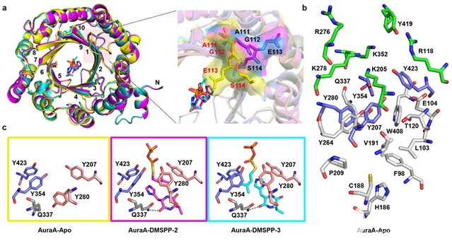 Researchers studied the structure of AuraA and its two ternary complexes (AuraA-DMSPP-2 and AuraA-DMSPP-3), systematically analyzing the conformational changes of residues within the catalytic pocket and the substrate binding modes. The research further revealed the influence of the relative positions and distances between the prenyl donor and acceptor on different catalytic modes and products, elucidating the structural basis and molecular mechanism of catalytic selectivity for AuraA-mediated imidazole prenylation. This study provides a new enzymatic tool for the alkylation modification of imidazole-based small-molecule drugs, and lays a structural foundation for understanding the recognition and catalytic mechanisms of the DMATS family of enzymes and improving their engineering.