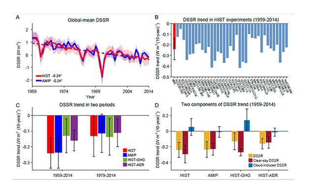 The study presents a comprehensive analysis of the historical changes in downward surface solar radiation (DSSR) from a global perspective (including both land and ocean). It stands as the first case to quantify the relative contributions of greenhouse gases and anthropogenic aerosols, highlighting the significant role of water vapor in the historical decline of DSSR. Furthermore, the study indicates that the future trajectory of DSSR is heavily dependent on emission scenarios. Therefore, the adoption of clean and low-carbon emission policies will be instrumental in mitigating further reductions in DSSR, thereby providing essential support for a smooth transition from conventional fossil fuels to renewable energy sources. This research not only enhances our understanding of atmospheric energy changes in the context of global warming, but also establishes a theoretical foundation for addressing global concerns and national demands related to variations in solar energy availability.