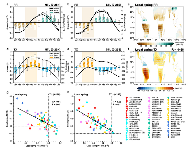 On an annual timescale, the tropics are primarily characterized by distinct wet and dry seasons. The hottest period of the year often occurs just prior to the onset of the rainy season; once the rainy season comes, the high temperatures are significantly alleviated. Previous studies have indicated that many tropical land monsoon regions are experiencing noticeable delays in the rainfall season due to global warming. The hypothesis that prolonged exposure to sunlight brings about intensified high temperatures was further put forward. This study, based on multi-model, multi-scenario simulations from CMIP5 and CMIP6, confirms the hypothesis, revealing that this phenomenon is particularly pronounced in the Amazon region (Figure 1). On the one hand, the delayed onset of the rainy season results in reduced cloud cover, leading to a significant increase in incoming shortwave solar radiation at the surface. On the other hand, the relative decrease in rainfall lowers soil moisture, which suppresses evaporative cooling effects and causes more energy to be released through sensible heat transport and longwave radiation, ultimately exacerbating warming. This phenomenon of hot season gets hotter is also aligned with the amplification of warming at higher percentiles of temperature.