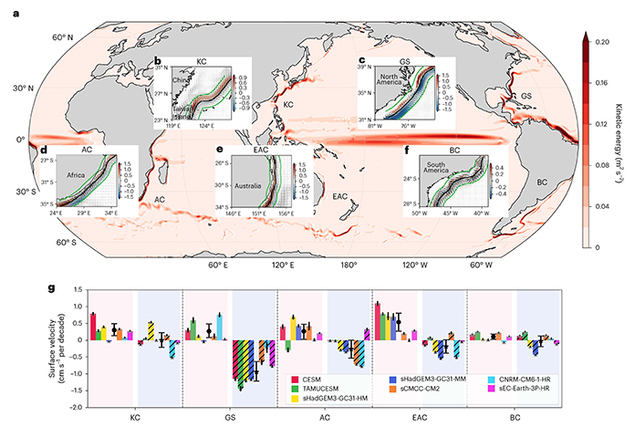 Subtropical WBCs are among the strongest ocean currents globally. They play a crucial role in the transport of oceanic mass and energy, and significantly influence coastal dynamics and ecosystems. Accurate assessment of changes in subtropical WBCs is therefore vital for global climate prediction and coastal environmental assessment. By analyzing data from high-resolution coupled atmosphere-ocean models, the team discovered that subtropical WBCs intensify significantly on their onshore side as global warming intensifies. The onshore acceleration ranges from 0.10 ± 0.08 to 0.51 ± 0.24 cm/s² per decade. Further study figured out a strong correlation between the onshore intensification of subtropical WBCs and changes in ocean stratification. By developing a dynamic model for the vertical scale of WBCs, the research revealed a dynamic link between the vertical scale of the WBC and ocean stratification. Their findings suggest that as ocean stratification intensifies, the vertical scale of subtropical WBCs will gradually decrease and shift upwards, resulting in an intensification of the current on its shoreward side.