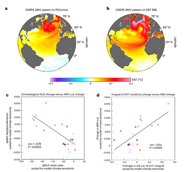 This study, based on multi-scenario and multi-model coupled atmosphere-ocean data from CMIP5/6, reveals that under global warming, the AMV exhibits enhanced amplitude and an extended period in its spatiotemporal evolution (Figures 1a, b). This is due, in part, to the melting of sea ice under global warming, which increases freshwater flux and surface heat flux. These increased fluxes suppress deep ocean convection in the subpolar North Atlantic, leading to a sharp decrease in the depth of the oceanic mixed layer (Figure 1c). With a shallower mixed layer, the reduced ocean heat capacity makes SST more sensitive to heat flux perturbations, thus enhancing the AMV amplitude. Furthermore, the weakening of deep convection also slows down the Atlantic Meridional Overturning Circulation (AMOC) and its associated northward heat transport. This extended accumulation time for SST anomalies promotes further enhancement of the AMV amplitude (Figure 1d).
