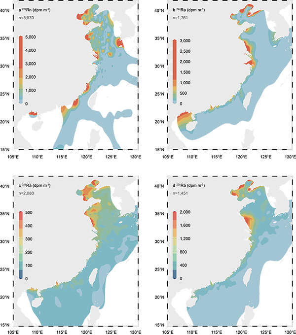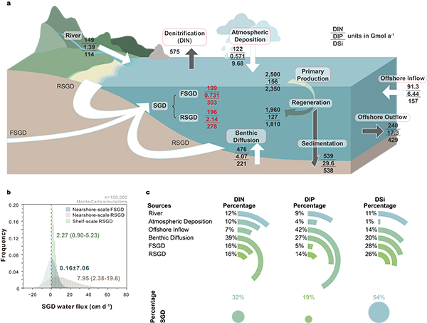 The research team developed a radium and radon isotope tracing model to address the challenges of quantifying different types of SGD fluxes. The team has long worked on the use of natural radium and radon isotopes as tracers for various oceanographic issues, accumulating extensive observational data. They have built a high-resolution database of radium (224Ra, 226Ra, 228Ra) and radon (222Rn) isotope concentrations in coastal seawater and groundwater along China’s coast. By doing so, the researchers clarified the distribution patterns of these isotopes in the region (Figure 1). The team then developed a multi-isotope quantitative model, distinguishing and quantifying FSGD and RSGD in China’s coastal waters. By leveraging Monte Carlo simulations, they assessed the uncertainties in the SGD calculation results. Their findings indicate that the fluxes of FSGD and RSGD are 3.56×108 m3 d-1 and 1.82×1010 m3 d-1 respectively in the nearshore waters (depths of 20-30 meters). The total SGD flux is approximately five times that of river runoff, with about 98% of the SGD flux coming from recirculated seawater. In the continental shelf region, the RSGD flux is around 2.09×1010 m3 d-1. Although the nearshore area accounts for only one quarter of the continental shelf, it contributes 87% of the RSGD flux, revealing that the nearshore shallow waters are hotspots for SGD.