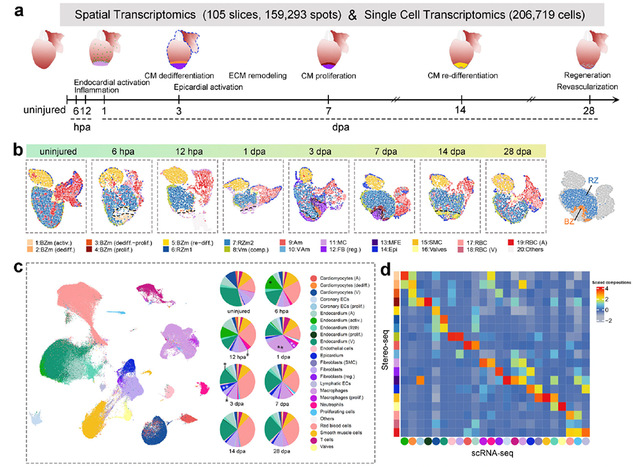 This study employed spatial transcriptomics (Stereo-seq) and single-cell transcriptomics (scRNA-seq) technologies to perform whole-organ dynamic analysis of the zebrafish heart across 8 key time points before and after injury, thereby creating a single-cell and spatiotemporal transcriptomic atlas of zebrafish heart regeneration. This atlas systematically captured and described the spatiotemporal interaction networks among various key cardiac cell types, including cardiomyocytes, endothelial cells, immune cells, and fibroblasts. Furthermore, combined with molecular and cellular experiments, the study specifically investigated the dynamic expression and functional necessity of the tpm4a gene during the redifferentiation event of newly formed cardiomyocytes, revealing the importance of the gene in heart regeneration.