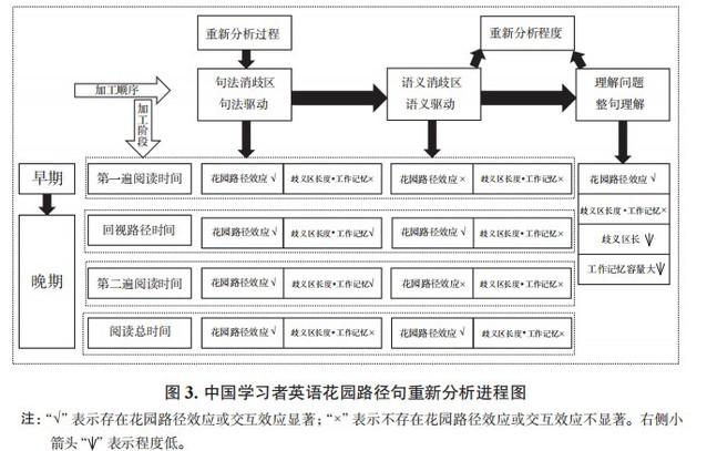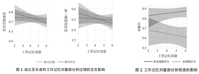 The garden path phenomenon is a specific type of local ambiguity encountered during language processing. Reanalysis in the processing of garden path sentences refers to the process by which language analysis mechanisms correct an initial analysis that is incompatible with subsequent syntactic representations. Using eye-tracking technology and comprehension questions regarding garden path structures, this study investigated reanalysis during the processing of English “direct object/subject” garden path sentences by Chinese learners of English, and further constructed a reanalysis process schema for these learners. The findings revealed that, in the early and late eye movement indicators during syntactic disambiguation, participants experienced the garden path effect and engaged in reanalysis. However, the analysis of late eye movement indicators during semantic disambiguation suggested that reanalysis is never fully completed and resolved for many sentences. The interaction effect between ambiguity length and working memory was significant in the late eye movement indicators of syntactic disambiguation (Figure 1). Participants with greater working memory capacity took less time to read longer garden path sentences, indicating that both factors interactively influence the reanalysis process. Furthermore, the analysis of accuracy indicated that there were significant interaction effects between sentence type, ambiguity length, and working memory (Figure 2). Participants showed lower accuracy in understanding longer garden path sentences, and those with higher working memory capacity also demonstrated lower accuracy in comprehending garden path sentences, suggesting that both factors affect the extent of reanalysis.