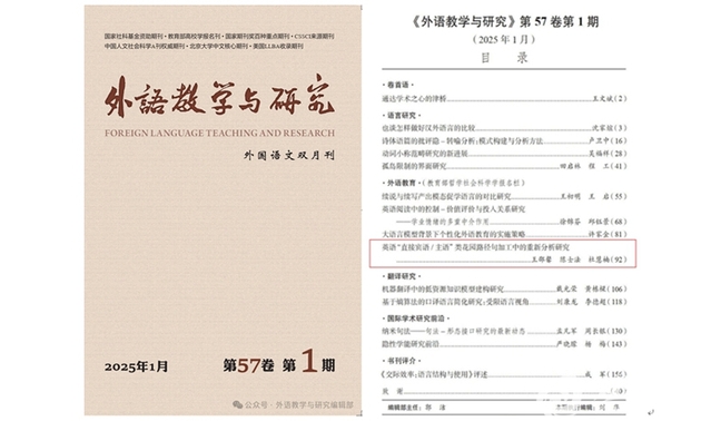 Recently, Wang Shaoxin, a doctoral candidate from the School of Foreign Languages, published a study titled Reanalysis in English “Direct Object/Subject” Garden Path Sentence Processing” in the journal Foreign Language Teaching and Research. This research was collaboratively conducted by members of the Shandong Provincial Higher Education Humanities and Social Sciences Experimental Laboratory (Class A) - the Interdisciplinary Research Laboratory of Second Language Acquisition.