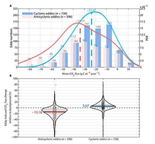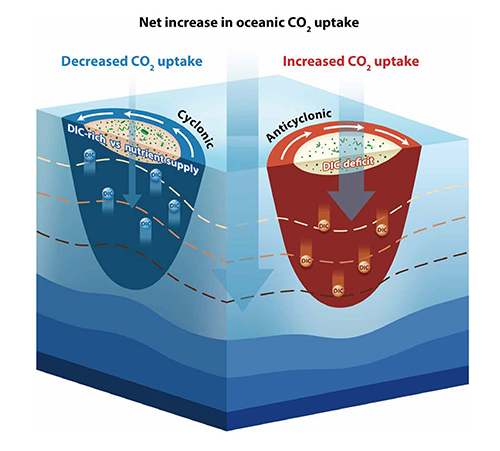 The study further revealed that the net increase in oceanic CO₂ absorption is driven by the eddy pumping effect of mesoscale eddies and asymmetric biological responses (Figure 2). Anticyclonic eddies decreased surface dissolved inorganic carbon (DIC) concentrations through eddy pumping, directly promoting CO₂ absorption. Although cyclonic eddies increased surface DIC concentrations through eddy pumping, the associated nutrient input stimulated phytoplankton activity, which consumed some of the DIC and mitigated the suppression of CO₂ uptake by cyclonic eddies.