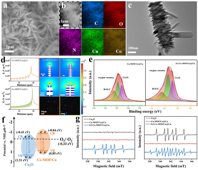 To address this challenge, inspired by natural structures, the research team adopted a template-directed growth strategy to fabricate a 3D hierarchical superstructure of well-aligned cobalt-copper bimetallic metal–organic framework (Co-MOF/Cu@Cu) arrays on a copper substrate. This distinctive architecture affords a large specific surface area and abundant surface-active sites, while exhibiting excellent stability. Experimental results show that when the air flows at 1.5m/s through the electrode under an AC voltage of 12-24V, the contact time is as short as 0.003s and the bacterial inactivation efficiency exceeds 99%; at 24V, the sterilization efficiency reaches 99.5%. Combining experiments and simulations, the team systematically revealed that the high sterilization performance stems from its synergistic mechanism of electroporation and reactive oxygen species (ROS). The unique tip-and-edge morphology significantly enhances the local electric field, rapidly disrupting the bacterial membrane via electroporation. Meanwhile, the external electric field drives the electrocatalytic reduction of oxygen on the material surface, generating reactive oxygen free radicals (exogenous ROS), which further interfere with bacterial metabolism and trigger the production of exogenous ROS, ultimately causing complete bacterial destruction through both physical and chemical methods.