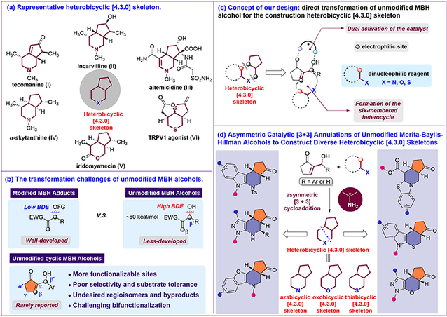 Heterobicyclic [4.3.0] skeletons, including azabicyclic [4.3.0], oxobicyclic [4.3.0], and thiabicyclic [4.3.0] skeletons, are widely found in natural products and pharmaceutically important molecules.  In existing synthetic strategies toward heterobicyclic [4.3.0] skeletons, chiral centers are typically introduced at an early stage, and multiple transformation steps are required. Recently, the research team reported their latest progress in this field in a paper entitled “Asymmetric Catalytic [3+3] Annulations of Unmodified Morita-Baylis-Hillman Alcohols to Construct Diverse Heterobicyclic [4.3.0] Skeletons”, published in the internationally renowned journal JACS Au. Using a chiral primary amine-acid synergistic dual-activation strategy, the team successfully activated unmodified MBH alcohols and developed a β,β′-site-selective asymmetric [3+3] annulation of these substrates. This general platform enables the construction of a series of structurally diverse, highly enantioselective chiral heterobicyclic [4.3.0] skeletons, including aza-, oxo-, and thia-bicyclic [4.3.0] frameworks, featuring a broad substrate scope, excellent stereocontrol, and good compatibility with late-stage modification of drug-like molecules. The reaction proceeds under mild conditions and is applicable to a variety of bioactive molecules, allowing convenient synthesis of numerous drug analogues and providing a general and efficient solution for MBH chemistry, the synthesis of chiral heterobicycles, and the rapid preparation of bioactive molecules.