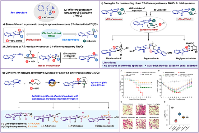 Between 2013 and 2023, 64% of new small-molecule drugs approved by the FDA were chiral, and 82% contained nitrogen heterocycles, underscoring the growing importance of chiral nitrogen-containing heterocyclic scaffolds in drug discovery. However, the asymmetric synthesis of chiral nitrogen heterocycles remains highly challenging. In particular, the 1,1-disubstituted tetrahydro-β-carboline (THβC) scaffold is a privileged framework with distinctive structural features and diverse biological activities. 1,1-Disubstituted THβCs bearing a C1 diheteroatom-bearing quaternary carbon center are prevalent in natural products and pharmaceutical molecules, yet catalytic asymmetric approaches to this scaffold remain elusive. Traditional methods, such as the Pictet–Spengler reaction, are generally ineffective for heteroatom-substituted carbonyl substrates, which hampers the key cyclization step and thus the asymmetric construction of such structures. In this context, the research team has developed an asymmetric catalytic annulation between dihydro-β-carbolines and enals to construct chiral C1 diheteroquaternary THβCs, enabling concise collective syntheses of multiple complex indole alkaloids. This approach also reveals excellent anti-influenza virus activity by targeting the viral NS1 protein.