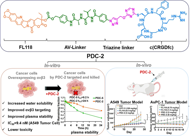 The team also successfully applied the triazine-based bioconjugation strategy to the development of PDCs. The related work, entitled “Conjugating 10,11-Dimethoxy-camptothecin with an Integrin αvβ3-Targeting Peptide through a Triazine Linker for Targeted Tumor Treatment in Lung and Pancreatic Carcinoma”, was published in Journal of Medicinal Chemistry. A key challenge of PDCs is their instability in the internal circulatory system, which can lead to payload release and systemic toxicity. By introducing a triazine linker, the team designed and synthesized the peptide-drug conjugate PDC-2, which shows high stability in plasma and achieves efficient tumor targeting and potent antitumor activity via integrin αvβ3-mediated internalization. Mechanistic studies revealed that PDC-2 dually inhibits Survivin protein expression and the PI3K/AKT/mTOR signaling pathway. In A549 and AsPC-1 xenograft models, PDC-2 demonstrated superior tumor growth inhibition, reduced systemic toxicity, and enhanced tumor specificity. Pharmacokinetically, it enables a sustained release of the parent drug, extending its half-life by 3.4-fold and promoting targeted tumor accumulation in tumor tissues, positioning it as a promising therapeutic candidate for lung and pancreatic cancers.