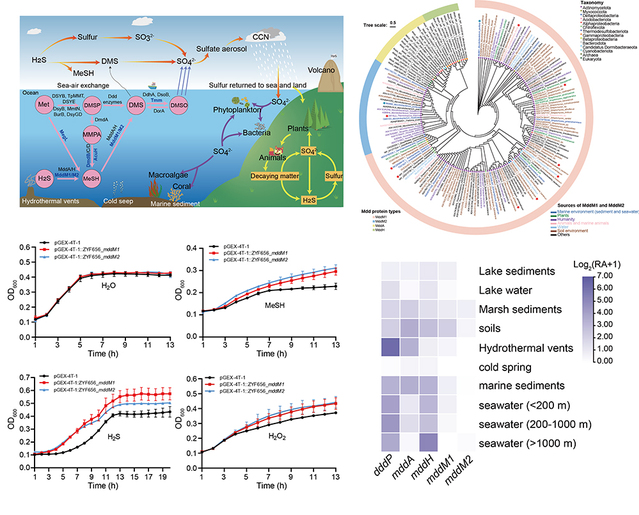 Building on this background, Professor Zhang Xiaohua’s team employed genomic library construction and gene knockout approaches to discover and identify two methyltransferases that are abundantly present in Actinomycetota, MddM1 and MddM2. They systematically characterized the catalytic properties of these two enzymes and found that their catalytic efficiencies are higher than that of MddA but lower than that of MddH. Functional experiments showed that transcription of mddM1 and mddM2 is induced by H2S, MeSH, and oxidative stress, and that these enzymes convert toxic H2S and MeSH into non-toxic DMS, thereby effectively alleviating oxidative stress and performing a clear physiological detoxification function. MddM1 and/or MddM2 are in >50% of Actinomycetota, including the model Streptomyces species, S. venezuelae, but are also seen in some ChloroflexotaAcidobacteriota, and ProteobacteriamddM1 is always more abundant than mddM2 in diverse environments and is prevalent in soils and marsh sediments. This study highlights the significance of H2S- and MeSH-dependent DMS production, and, principally, of Actinomycetota in global DMS production and sulfur cycling.