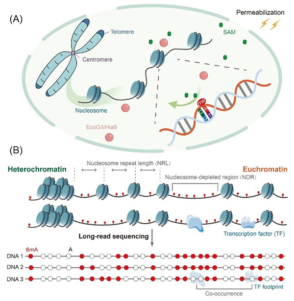 DNA N6-methyladenine (6mA), as a new epigenetic mark, is widely distributed in prokaryotes and lower eukaryotes but is relatively scarce in most higher eukaryotes, thereby providing a cleaner background for leveraging 6mA methyltransferases (MTases) to probe chromatin structure. The sequence-independent 6mA MTases, EcoGII and Hia5, due to their potent catalytic activity and broad substrate range, have become core tools in 6mA epigenetic engineering. In recent years, third-generation sequencing (TGS) technologies, especially platforms developed by Pacific Biosciences (PacBio) and Oxford Nanopore Technologies (ONT), have enabled the direct detection of DNA modifications at single-base resolution by measuring perturbations in DNA polymerase kinetics or changes in ionic current, respectively. Compared to second-generation sequencing, TGS does not require PCR amplification or DNA fragmentation, allowing for the direct detection of epigenetic marks and faithfully capturing single-molecule heterogeneity, while overcoming the mapping challenges posed by highly repetitive and structurally complex genomic regions.