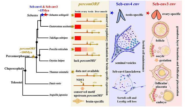 In the course of searching for “fish syncytins”, the research team unexpectedly identified two additional env genes with distinct functions, revealing multidimensional innovation in viral gene co-option. One is percomORF, an ancient env gene that is highly conserved across Percomorpha and shows brain-specific high expression, with its transcription tightly regulated by NDF2, the host neurogenic differentiation factor. The capture of this gene predates the origin of viviparity in the genus Sebastes, suggesting that it may have been co-opted by ancestral Percomorpha to contribute to the formation or signaling of neural circuits. The other, Seb-env4, is specific to S. schlegelii and has been integrated into the regulatory mechanisms of the male reproductive system.