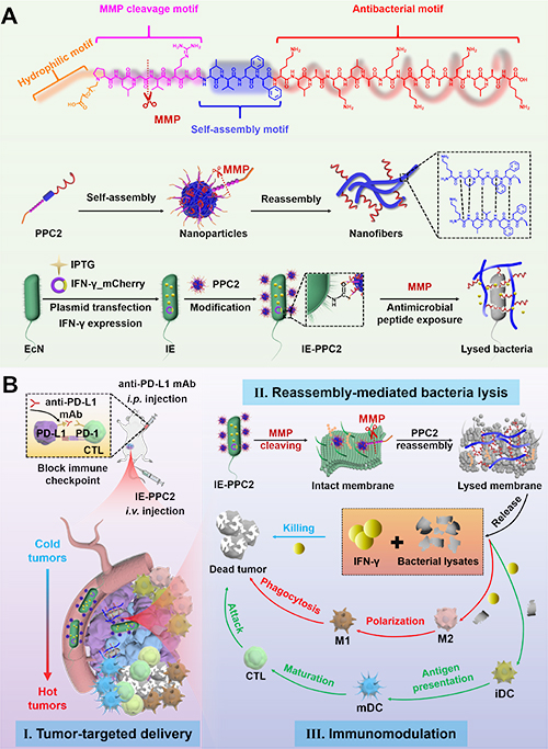 In this study, the researchers developed a bacteria-nanomaterial hybrid system, IE-PPCs. By transforming the IFN-γ gene into E. coli Nissle 1917 (EcN), the researchers obtained the engineered bacterium IE and anchored it onto the polymer-peptide conjugates (PPCs) with matrix metalloproteinases (MMPs)-responsive bacteria through amide bonds. Upon intravenous injection, the IE-PPCs system is selectively colonized into the tumor microenvironment, where MMPs are highly expressed. The PPCs spontaneously transformed into fibrous nanostructures, exposing antimicrobial peptide residues that specifically lyse the bacteria, thereby releasing IFN-γ and bacterial lysates. Both in vitro and in vivo experiments showed that IE-PPC2 systems successfully achieved MMP-responsive bacterial lysis and triggered IFN-γ release. The bacterial lysates and released IFN-γ synergistically polarized M1-type TAM, induced dendritic cells (DC) maturation, shifting the tumor microenvironment (TME) from “cold” into a more immunologically active “hot” state. In 4T1 mouse breast cancer models, IE-PPC combined with anti-PD-L1 therapy achieved 89.7% anti-tumor rate, and bacterial loads within tumors decreased by 98.9%. The treatment also induced long-term immune memory, effectively suppressed tumor recurrence and metastasis, and showed good biosafety.