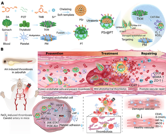 In this study, the team successfully engineered a pathogenesis-driven nanomotor system (PSr@PT NPs). Its core is composed of strontium (Sr)-doped mesoporous polydopamine (PSr NPs), which acts both as a nanomotor base and as a reservoir for oxidative stress-triggered Sr2+ release, while simultaneously serving as a ROS scavenger. To achieve dual-targeted propulsion, a hybrid cloak integrating platelet membranes (PM) and spinach-derived thylakoid membranes (TKM) was constructed on the surface of PSr NPs. PM enables precise homing to activated endothelial cells at thrombotic sites, whereas TKM confers catalase-like activity, continuously decomposing H2O2 into O2 to power autonomous motion. Ultimately, the system mitigates platelet-endothelial adhesion by suppressing inflammation and oxidative stress. Upon NIR irradiation, the PSr core generates mild photothermal heating (approximately 40 °C), achieving dual thrombolytic effects through direct thermal clot dissolution and improved nanoparticle infiltration. Concurrently, controlled Sr2+ release from the PSr NPs promotes endothelial regeneration and barrier restoration, thereby interrupting the cycle of thrombosis recurrence. The universal thrombolytic efficacy of this nanosystem was validated across species-specific models, including arachidonic acid (AA)-induced thrombosis in zebrafish and ferric chloride (FeCl3)-induced carotid embolism in mice. By combining the catalytic functions of plant photosynthetic membranes with the targeting precision of mammalian systems, this cross-species synergistic strategy establishes a new paradigm in nanobionics. This biomimetic structure organically integrates biological signal transduction (platelet-endothelial recognition) with physical stimulus responsiveness (photothermal driving), reshaping the thrombotic microenvironment while promoting deep penetration into clots. This multidimensional treatment strategy upgrades “instant thrombolysis” to “sustained vascular functional recovery”, providing a nanoplatform with translational potential for precise antithrombotic therapy.