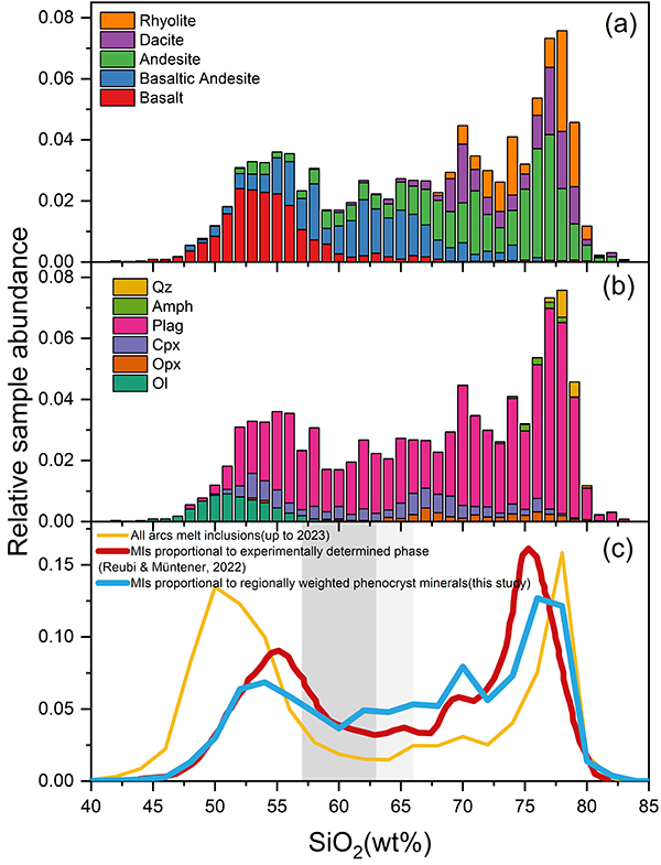 Melt inclusions are small parcels of melt trapped in minerals during crystal growth. They preserve compositional data from various magmatic stages, acting as “liquid snapshots” of melt development. Previous work suggested that the SiO2 contents of melt inclusions in arc volcanic rocks exhibit a bimodal distribution, apparently supporting magma-mixing models. However, some researchers pointed out that this bimodal distribution may result from sampling bias and could instead be more consistent with fractional crystallization models. To address this, the research team recalibrated and systematically analyzed melt inclusion data from arc volcanic rocks by weighting them according to the natural proportions of different lithologies in arc volcanic suites and the composite abundances of phenocryst minerals in each rock type.