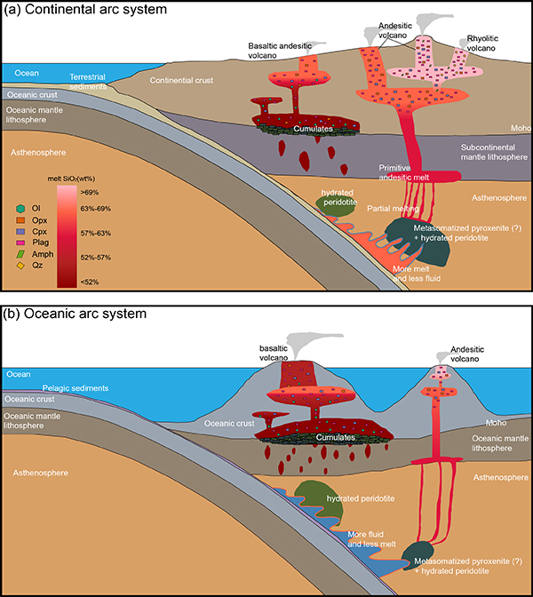 In addition, this study helps resolve three long-standing paradoxes in conventional basalt differentiation models: (1) the predicted but rarely observed large volumes of ultramafic cumulates in the arc lower crust, (2) the high-MgO content in many andesites (high-magnesium andesite), and (3) the apparent inconsistency between natural observations, which require andesite compositions to reflect high-pressure differentiation, and experimental results showing that high-pressure fractional crystallization tends to generate peraluminous intermediate melts, whereas most natural andesites are metaluminous.