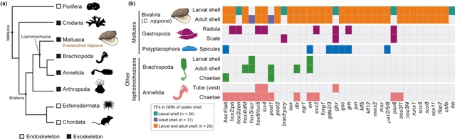 The study found that although larval and adult shells differ markedly in morphology, structure, and protein composition, the upstream transcription factor networks underlying their formation are highly conserved and originated before the emergence of molluscs. These transcription factors (TFs) show relatively stable expression across developmental stages, whereas the effector genes directly involved in biomineralization exhibit pronounced stage-specific expression. Further analyses showed that stage-specific remodeling of regulatory element activity enables dynamic chromatin landscapes to reconnect conserved TFs with rapidly evolving effector genes, thereby switching biomineralization programs across life stages and generating diverse skeletal architectures from the same underlying genetic framework. Cross-species comparisons further showed that these key TFs are also widely recruited during larval exoskeleton formation in other lophotrochozoans, supporting the existence of a conserved biomineralization regulatory “toolkit” in lophotrochozoans. By further comparing the GFNs underlying biomineralized skeleton formation in molluscs and echinoderms, the researchers found that although the two groups differ fundamentally in structure and developmental trajectory, both achieve convergent evolution of skeletal traits through heterochronic deployment of ancestral TFs. This suggests that upstream regulatory modules are under deep evolutionary constraint, whereas phenotypic diversity is primarily driven by the remodeling of downstream effector genes and the regulatory elements.