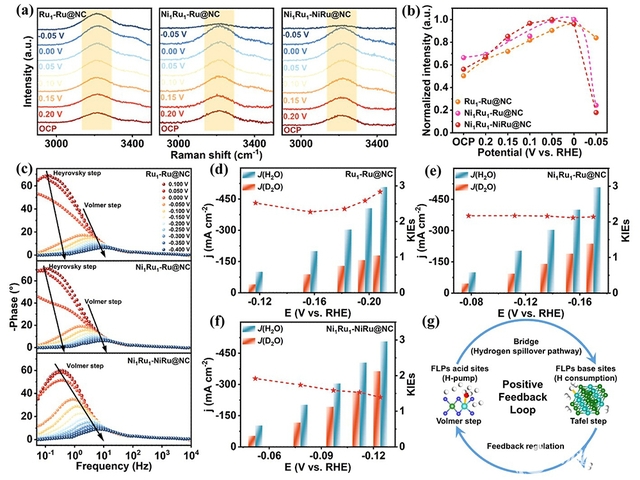 To address these challenges, the research team drew inspiration from the concepts of “positive feedback” and “cascade catalysis” in enzymatic systems and introduced them into the area of electrocatalytic HER. They successfully designed a catalyst comprising NiRu dual single-atoms and adjacent NiRu nanoclusters anchored on nitrogen-doped carbon (Ni1Ru1-NiRu@NC). In this catalyst, the atomic Ni and alloyed Ni sites could precisely tailor the electronic structure of neighboring Ru species, giving rise to the corresponding electron-deficient and electron-rich Ru centers that function as Lewis acid and base sites, respectively. The synergistic cooperation between these acid-base sites enables highly efficient hydrogen evolution. Specifically, the Lewis acid Ru sites facilitate the highly effective dissociation of water and continuously supply protons, while the generated protons are swiftly transported through a high-speed hydrogen spillover channel to adjacent Lewis base Ru sites, where they are consumed for hydrogen production. In turn, the rapid proton consumption at the base sites drives further continuous water dissociation at Lewis acid sites, thereby establishing a self-reinforcing catalytic cycle. This catalyst delivers a current density of 1.0 A cm−2 at an overpotential of only 246 mV and exhibits operational stability for over 800 h. More importantly, the AEMWE device assembled with a cathode of Ni1Ru1-NiRu@NC exhibits exceptional long-term stability at 1.0 A cm−2 over 1000 h with a low degradation rate of 0.015 mV h−1. This work proposes a positive feedback-driven coupling strategy that enables cascade acceleration of HER elementary steps, providing a new pathway for the design of highly efficient alkaline HER catalysts and the practical application of AEMWEs. The related results were published in Angewandte Chemie International Edition under the title “Positive Feedback-Driven NiRu Frustrated Lewis Pairs Catalyst Enables a Self-Reinforcing Catalytic Cycle for Cascade-Coupled Hydrogen Production”.