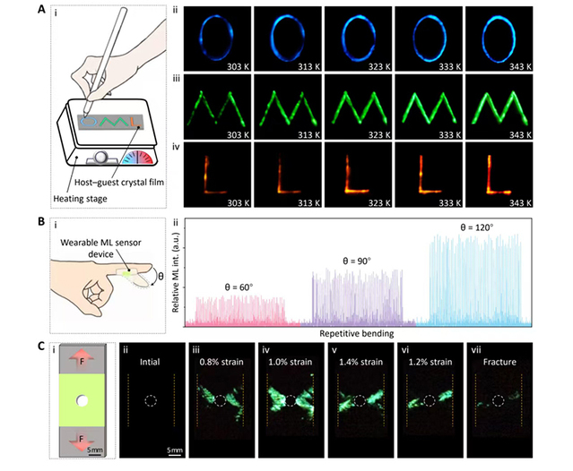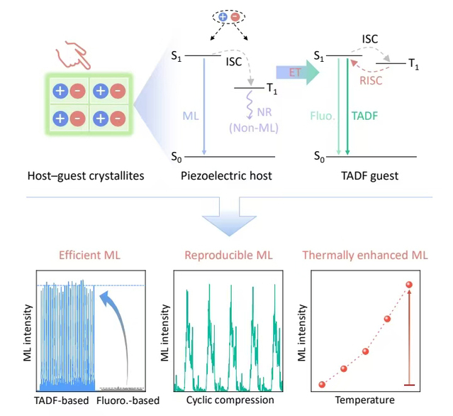 To address these bottlenecks, the research team introduces a design strategy that places the guest molecules at the center of the system by using thermally activated delayed fluorescence (TADF) emitters in combination with piezoelectric host materials that respond to mechanical force. Using the green TADF emitter 4CzIPN as a model guest, the resulting systems exhibit highly reproducible ML responses, maintaining near-cyclic stability over 900 consecutive compression cycles. Compared with conventional fluorescent guest systems, TADF-based systems display up to a 38-fold enhancement in ML intensity and pronounced thermal robustness. Morphological studies indicate that intact crystallites are preserved during cyclic deformation, which most likely drives the host’s stable mechano-electrical response and provides the structural basis for reproducible ML output. Transient photophysical measurements and theoretical calculations further suggest that TADF guests increase the effective dipole moment of the host matrix, potentially strengthening mechano-electrical coupling, while simultaneously enabling the efficient harvesting of mechanically generated triplet excitons through host-guest triplet energy transfer and charge transfer, leading to markedly improved exciton utilization. Extending this strategy to blue and red TADF emitters yields tunable ML across the visible spectrum. In addition, this material system has demonstrated application potential in thermally robust stress mapping, wearable stress sensing, and real-time structural health monitoring, laying the groundwork for advanced smart luminescent and passive sensing technologies.