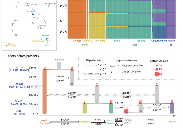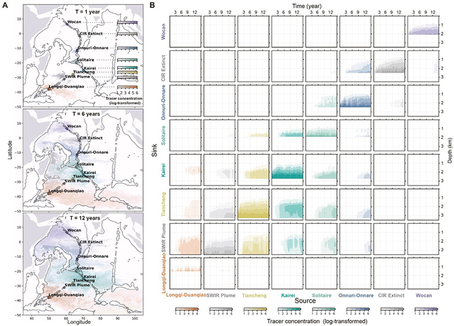 To unravel this mystery of dispersal in this deep-sea species, a team led by Professor Sun Jin at OUC, in collaboration with research institutions in South Korea and Japan, carried out a population genomic study of the scaly-foot snail. Samples were collected during 17 research cruises conducted between 2013 and 2023, covering a total of 125 individuals from eight hydrothermal vent fields across the entire known range of the species in the Indian Ocean, and were subjected to whole-genome resequencing analysis. The study identified five genetic groups of the scaly-foot snail and reconstructed its population history. The results showed that present-day scaly-foot snail populations originated from the south end of the Southwest Indian Ridge and then dispersed northward along the mid-ocean ridges, from the Longqi-Duanqiao hydrothermal vent fields at the southernmost end to the Wocan field at the northernmost end of the Carlsberg Ridge, over a timespan of approximately 240,000 years. Combined with physical oceanographic modeling, the study further revealed that deep currents are the main force driving gene flow in this species. This gene flow follows a bidirectional but asymmetrical pattern, particularly the south-to-north directionality, while transformation faults along the ridges act as natural geographic barriers restricting larval dispersal. Demographic history analyses also revealed that the extinct or unsampled “ghost populations” played an indispensable role in the long-distance dispersal of the scaly-foot snail across ocean ridges.