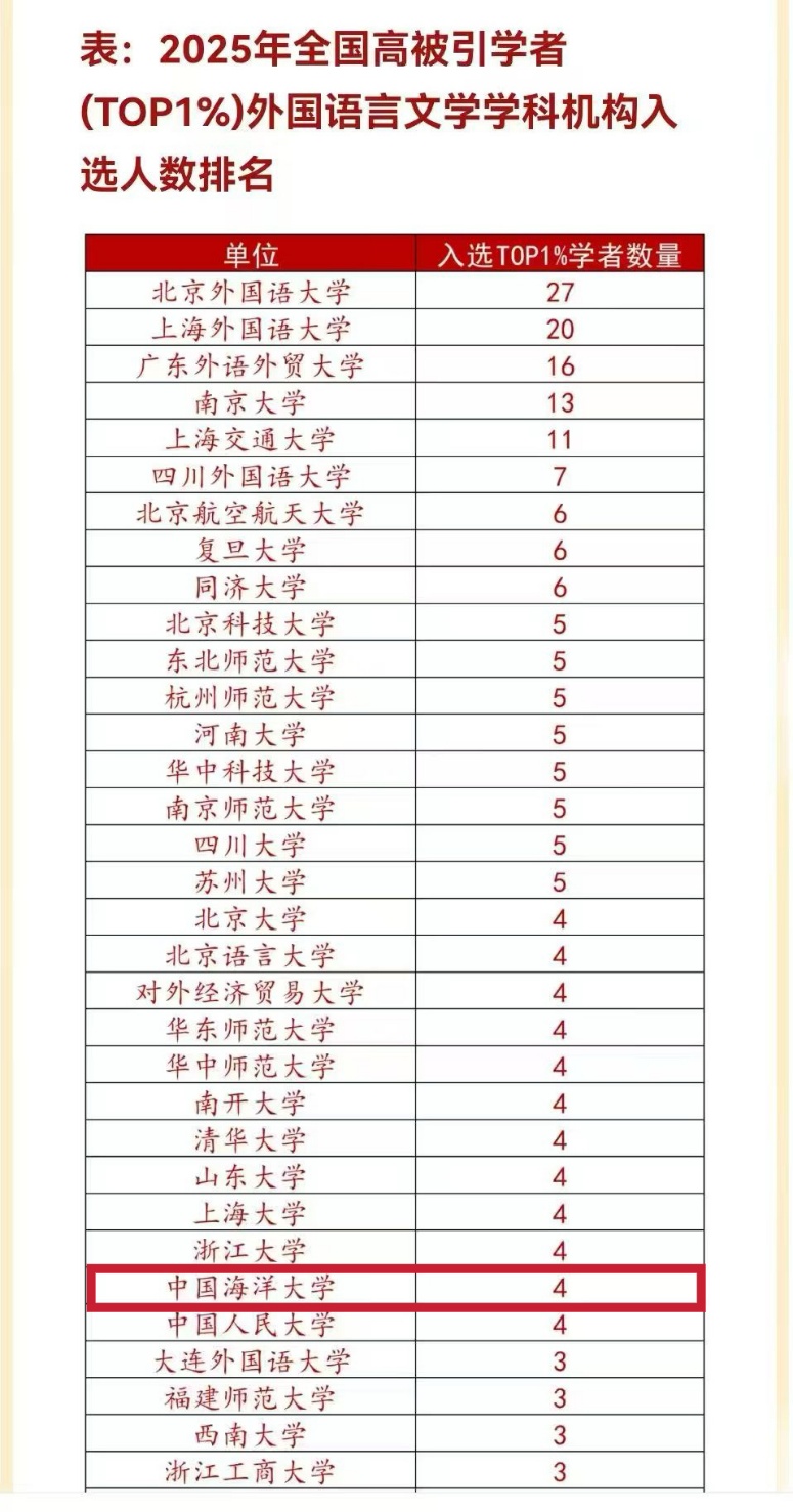 Recently, the China National Knowledge Infrastructure (CNKI), through its China Scientific Literature Evaluation and Metrics Research Center, officially released the 2025 National Highly Cited Scholars list. A total of nine scholars from the College of Foreign Languages, Ocean University of China, were presented in the list. Notably, in the discipline of Foreign Languages and Literature, the College ranks tied for 18th nationwide in terms of the number of scholars listed in the Top 1%, underscoring its strong momentum in producing high-quality research and its growing academic influence in the field.